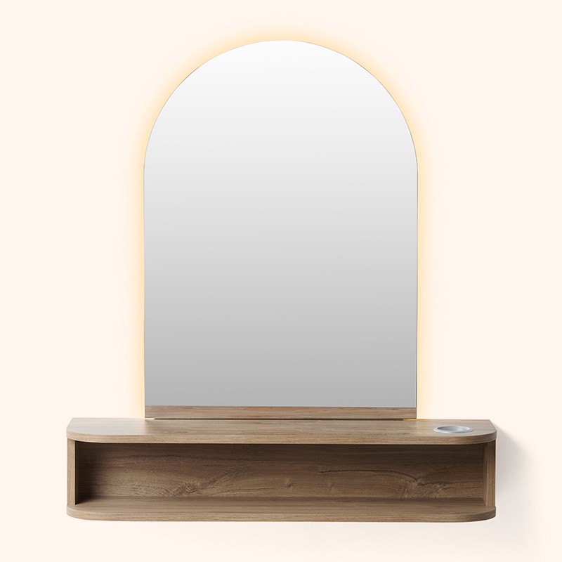 Floating wall mirror with an oval design. Its support base provides an organic and soft touch to the styling area.