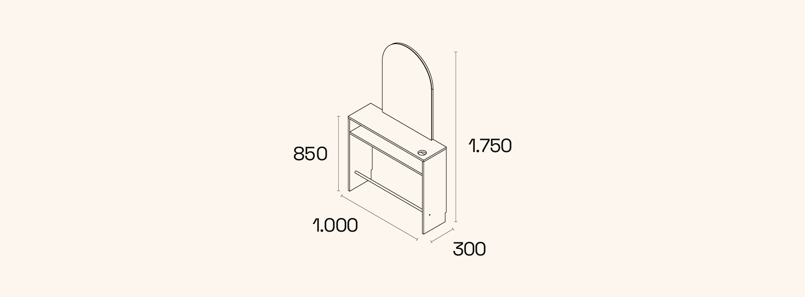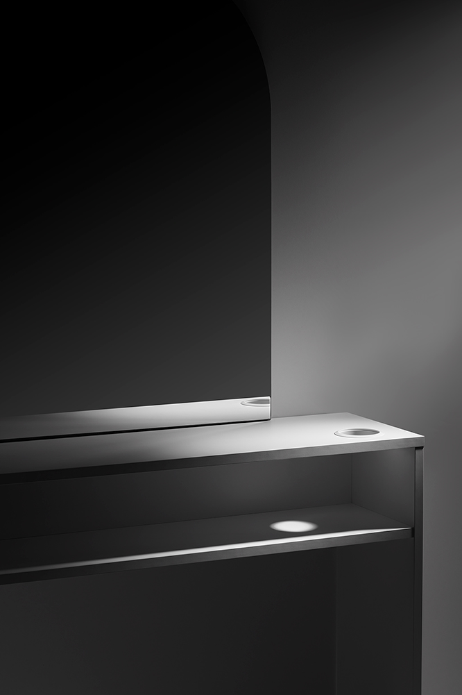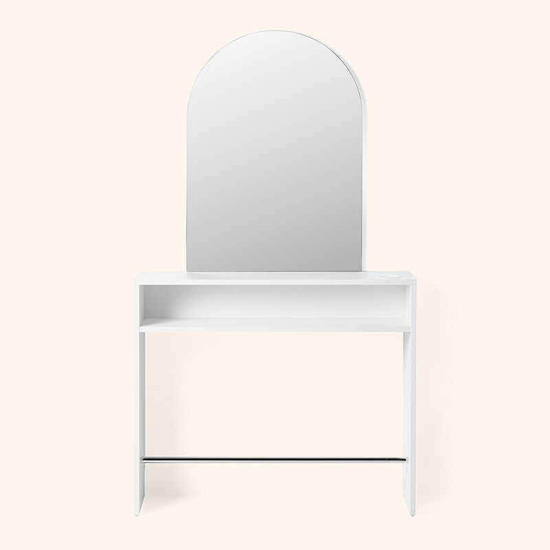 Minimalist styling unit with an arch-shaped rectangular mirror. Its visual lightness is perfect for an elegant and uncluttered salon.