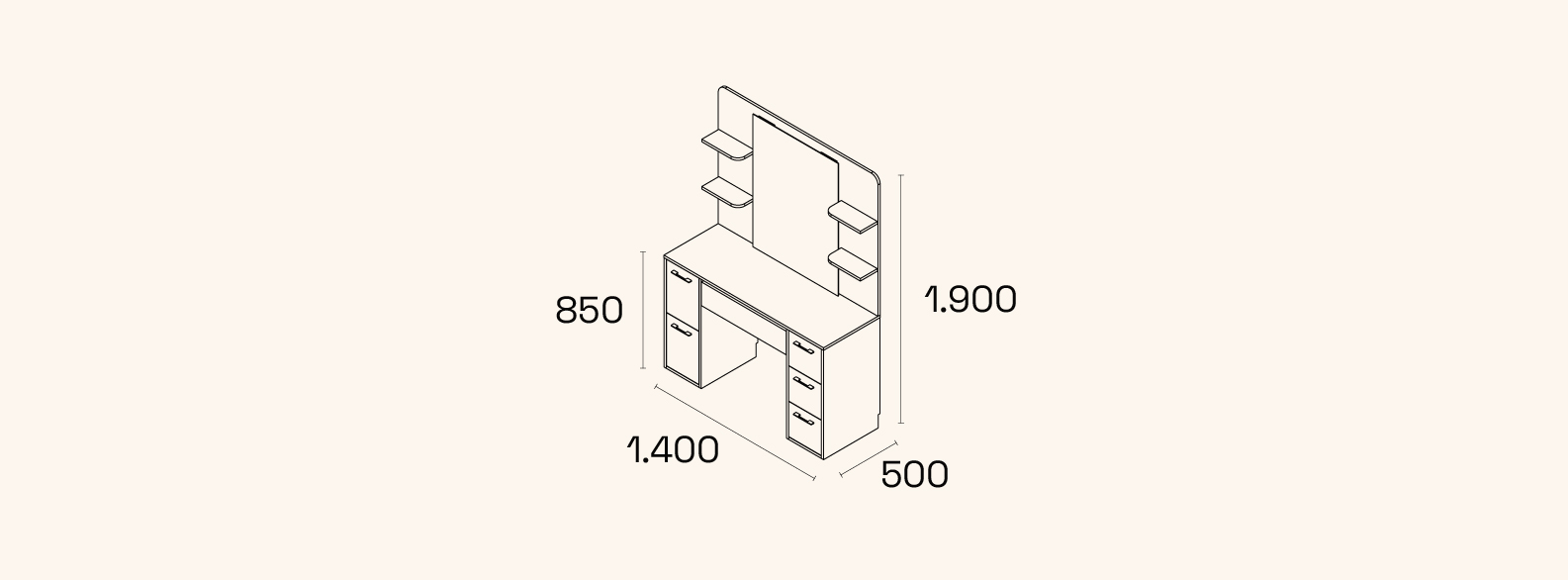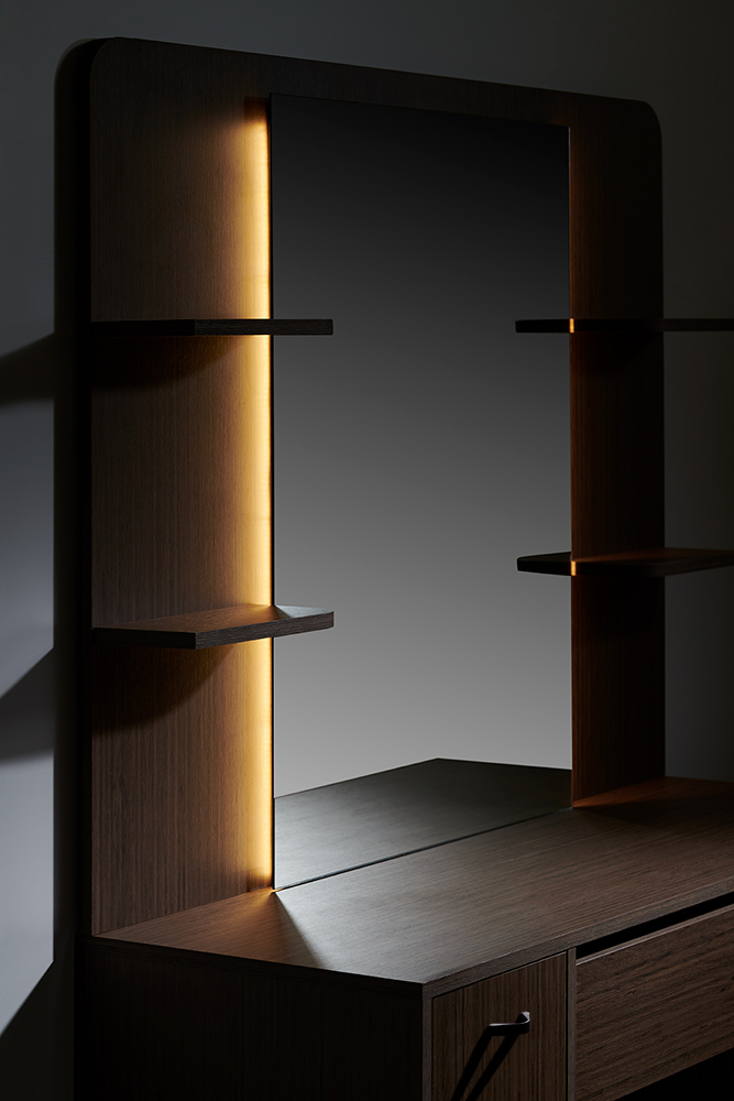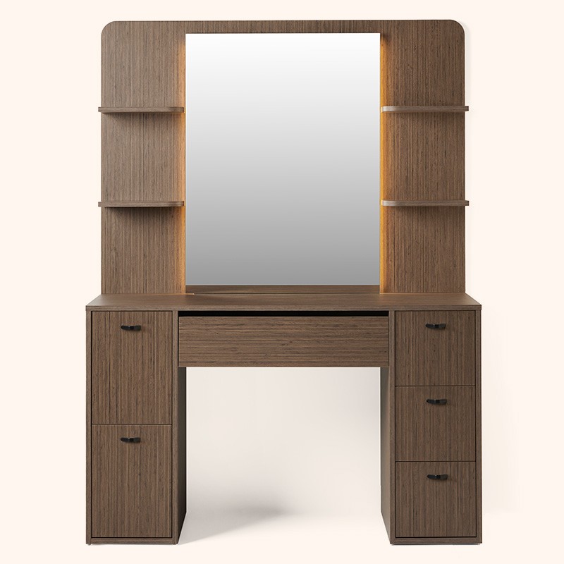 Styling unit with shelves and compartments. An ideal design to create a shared and practical work zone without compromising on style.