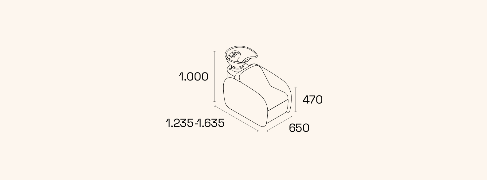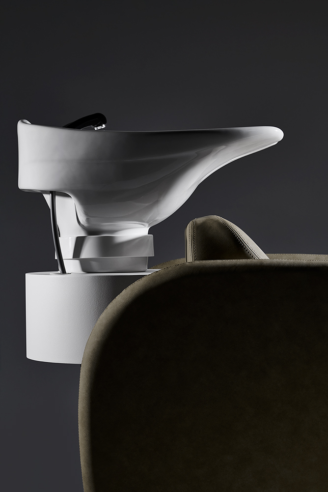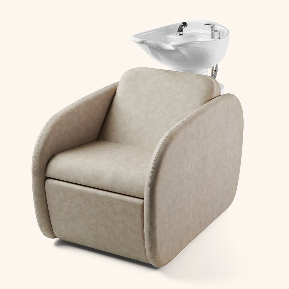 Lavacabezas de estilo compacto y minimalista. Su diseño redondeado, perfecto para salones de atmósfera cuidada. Se puede añadir reposapiés.