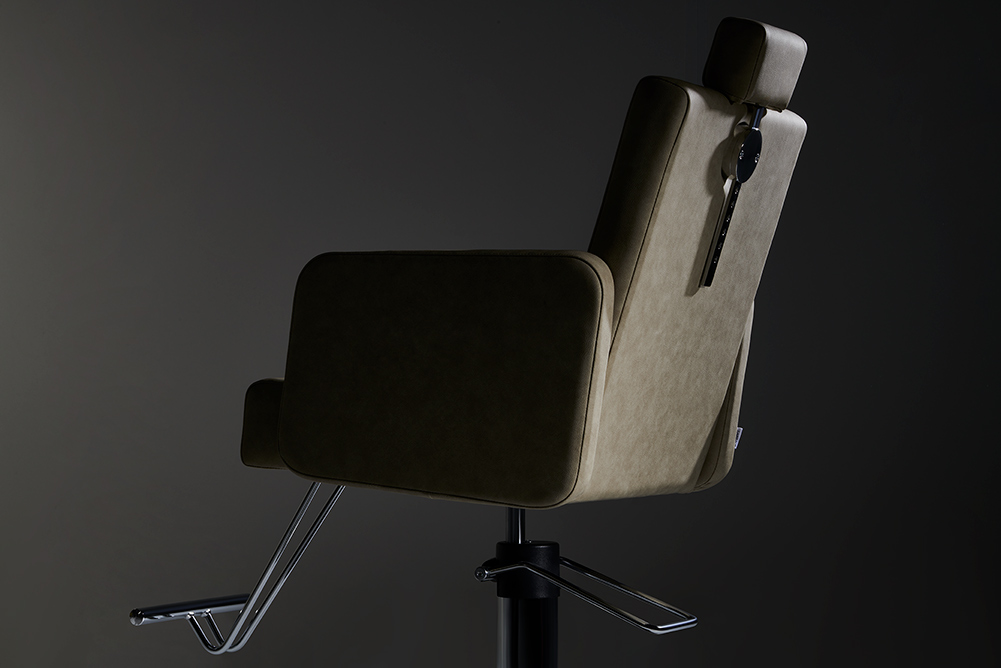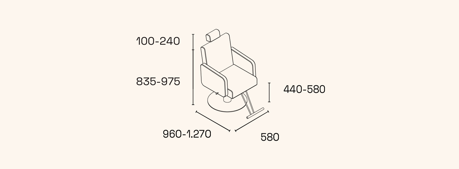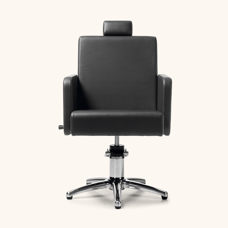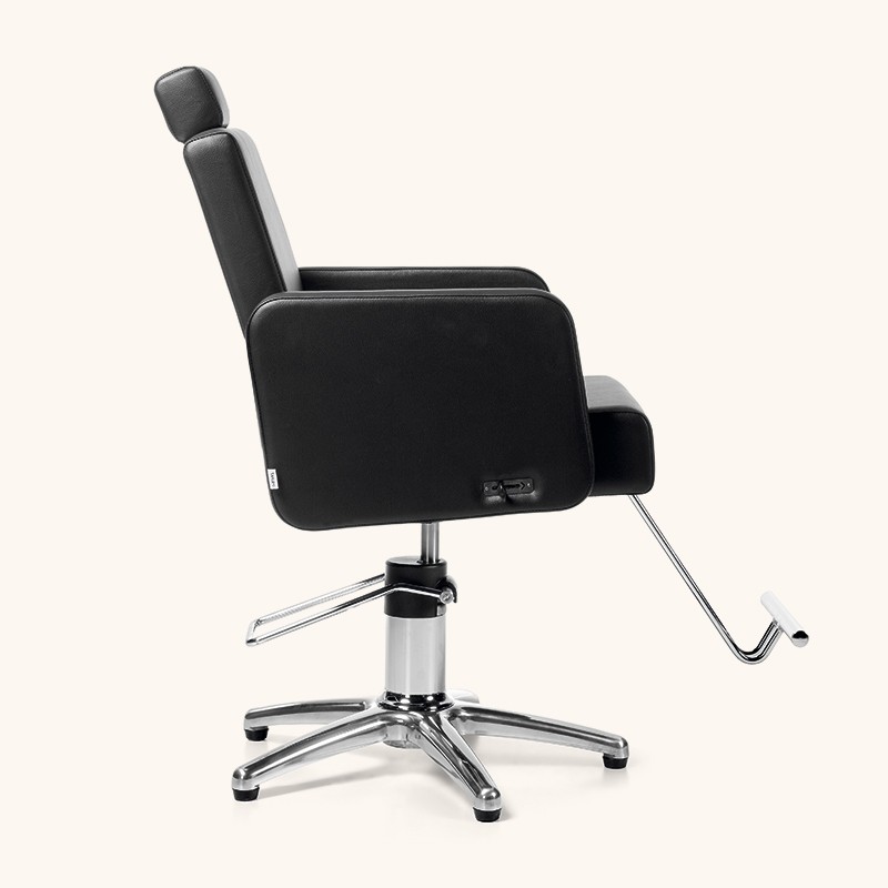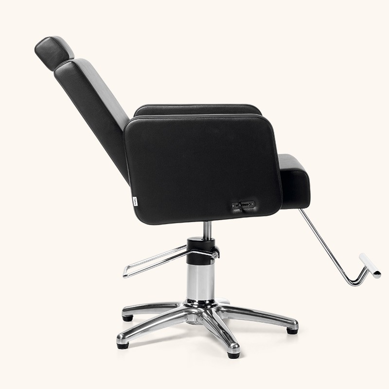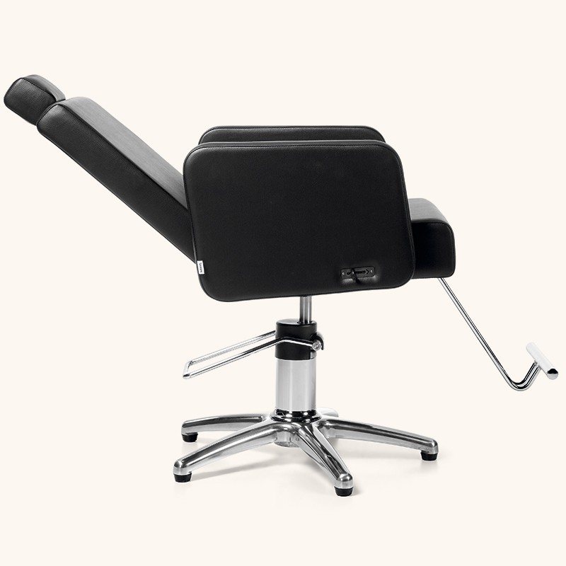 Diseño de respaldo alto reclinable y reposapiés incorporado. Ofrece máxima versatilidad para servicios de maquillaje, rizos, o barbería.