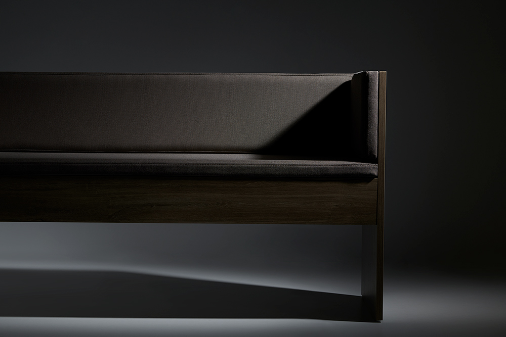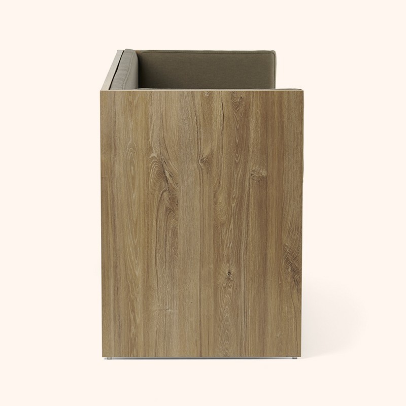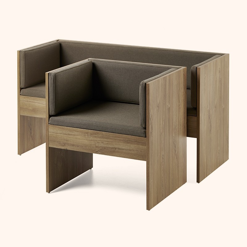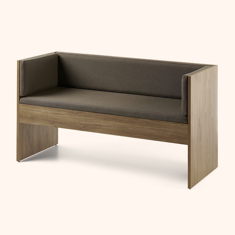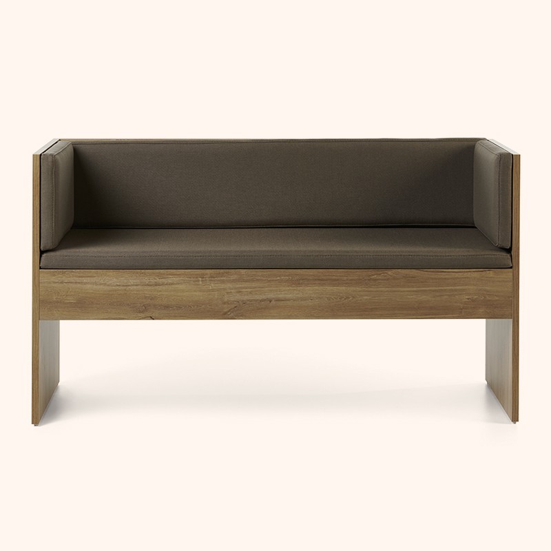 Banco de dos plazas que sigue el estilo Haruka. La estructura baja y cálida de madera crea un ambiente de bienestar y relax, ideal para la primera impresión.