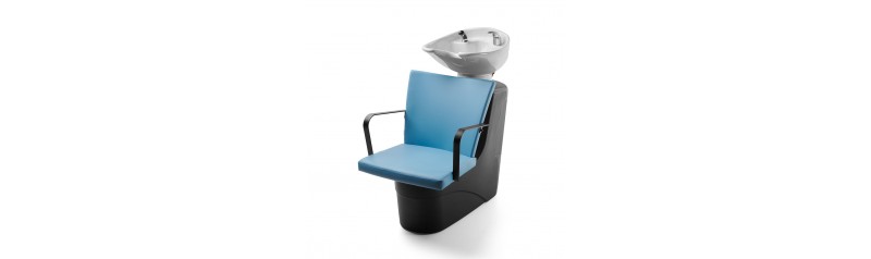 Lavacabezas de líneas geométricas que integra el sillón Riki. Su ligereza visual es ideal para salones que buscan un ambiente fresco y dinámico. Fácil de montar en línea con Link Unit KAI.