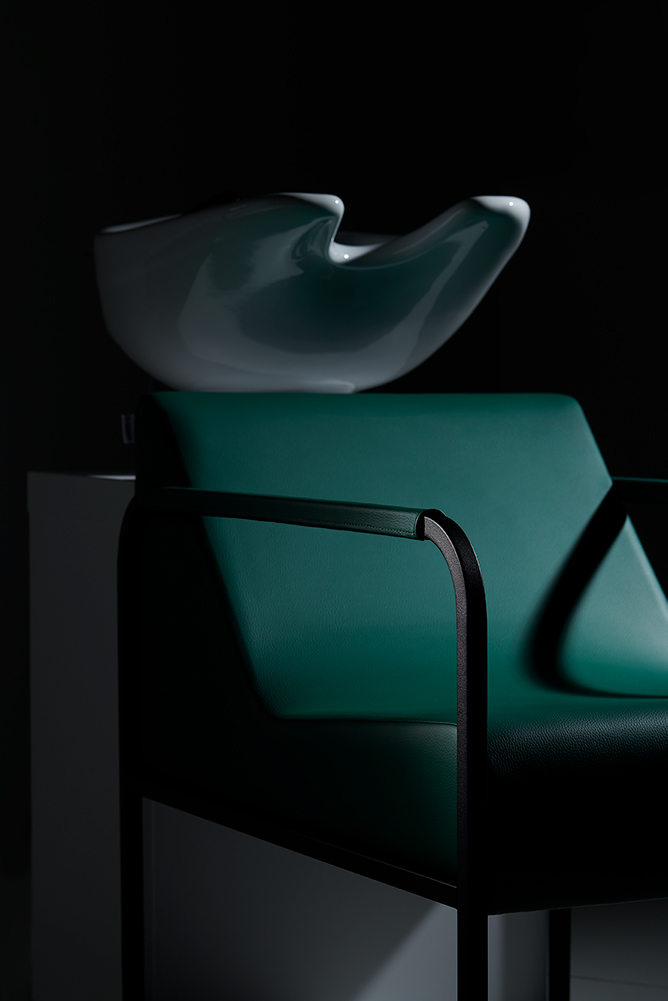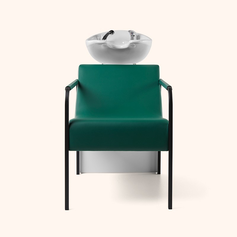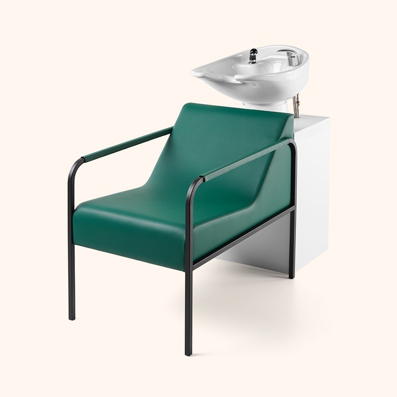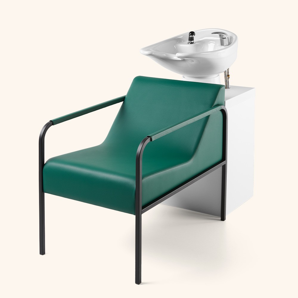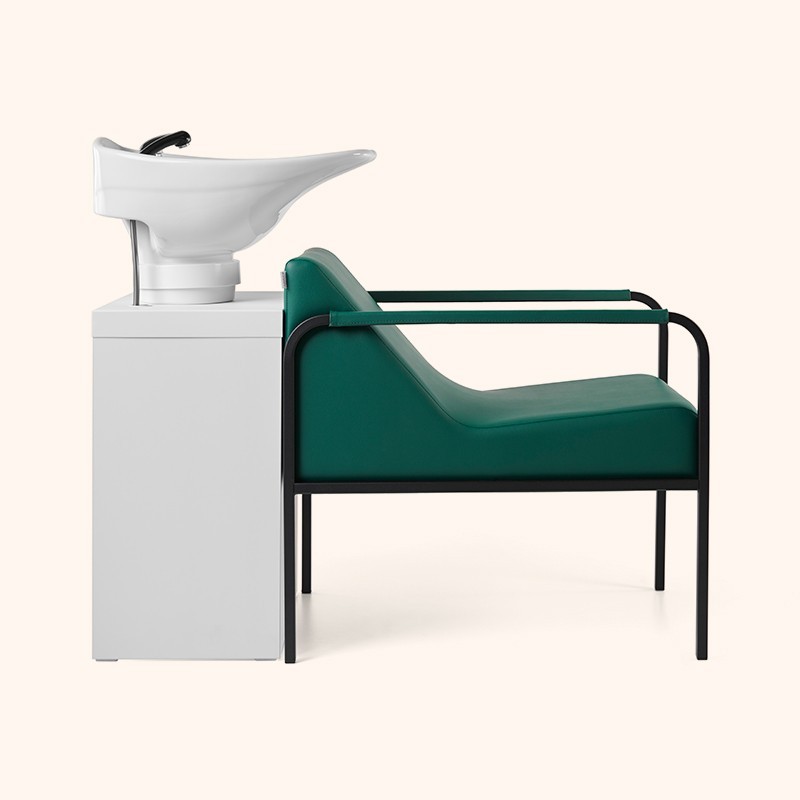 Lavatesta della gamma YUTO in stile retrò con braccioli tubolari, in abbinamento alla poltrona YU-R. Design modulare che aggiunge un tocco vintage ed è compatibile con il poggiapiedi DOT.